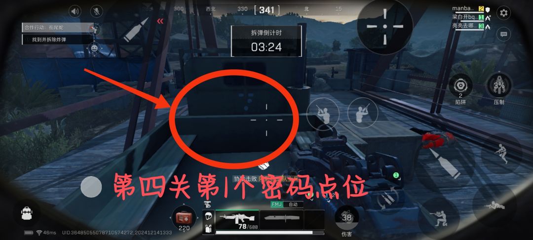 第二个密码:位于第二关被敌人拦路的时候,右手边的墙上,需要使用倍镜才能看清楚《图六》