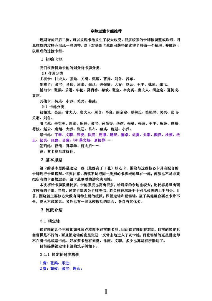 近期夺帅开启二测,可以发现卡池发生了较大改变,很多较强的卡牌被调整或取缔,因此往期的攻略会出现一些调整。以下对基础卡池即可获得的武将卡牌做一个梳理,并推荐可以组成的过渡卡组。