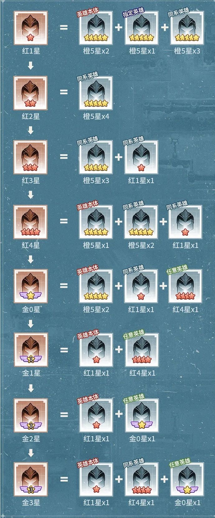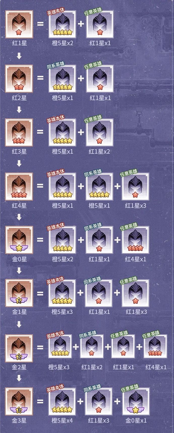 有的人会说,哎呀,升6星不是只要一个本体吗,那你没看懂图,图片的意思是一个6星,需要一个英雄吞噬同一个本体(这样就是两个英雄本体)➕4张同系狗粮