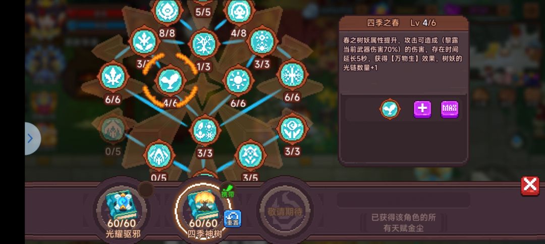 2.核心机制:为四季轮换 春天给召唤物回血 夏天提供暴击率 秋天产出果实 冬天清除万灵召唤物(不清除万灵组合召唤物如龙术士)