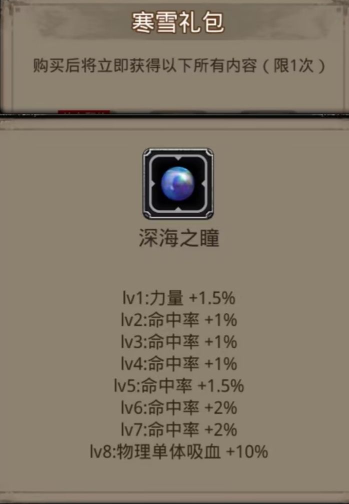 作为一个68礼包,小萌新觉得深海之瞳还是相当值得入手的,毕竟很多强势的氪金战利品基本都在198礼包里面,而寒雪礼包作为一个68价位的礼包,它的强度还是无愧于这个价位的。