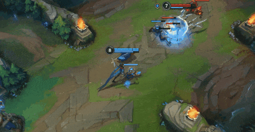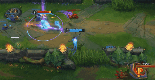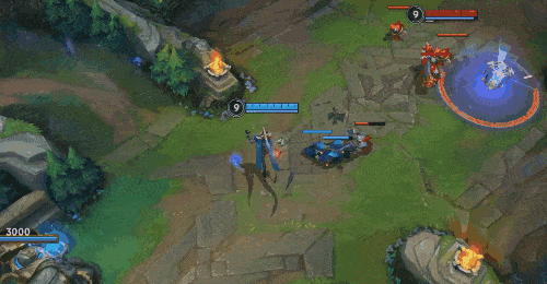 W(2)技能不仅可以打出控制效果,也是限制敌人走位分割战场的利器。实战中,我们可以保留此技能,当敌方打野前来gank时,用来封闭路线,从而更好地逃生或是反打。