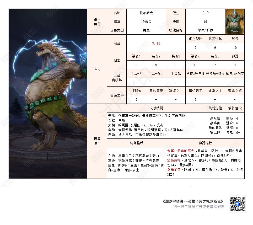 本帖为个人发布的有关潮汐守望者的系列攻略的索引贴,方便查找。**关于英雄综合评分算法说明**目前,综合评分是在单项评分的基础上,结合英雄泛用程度,用一套算法计算得出,大部分英雄评分与使用感受符合,...