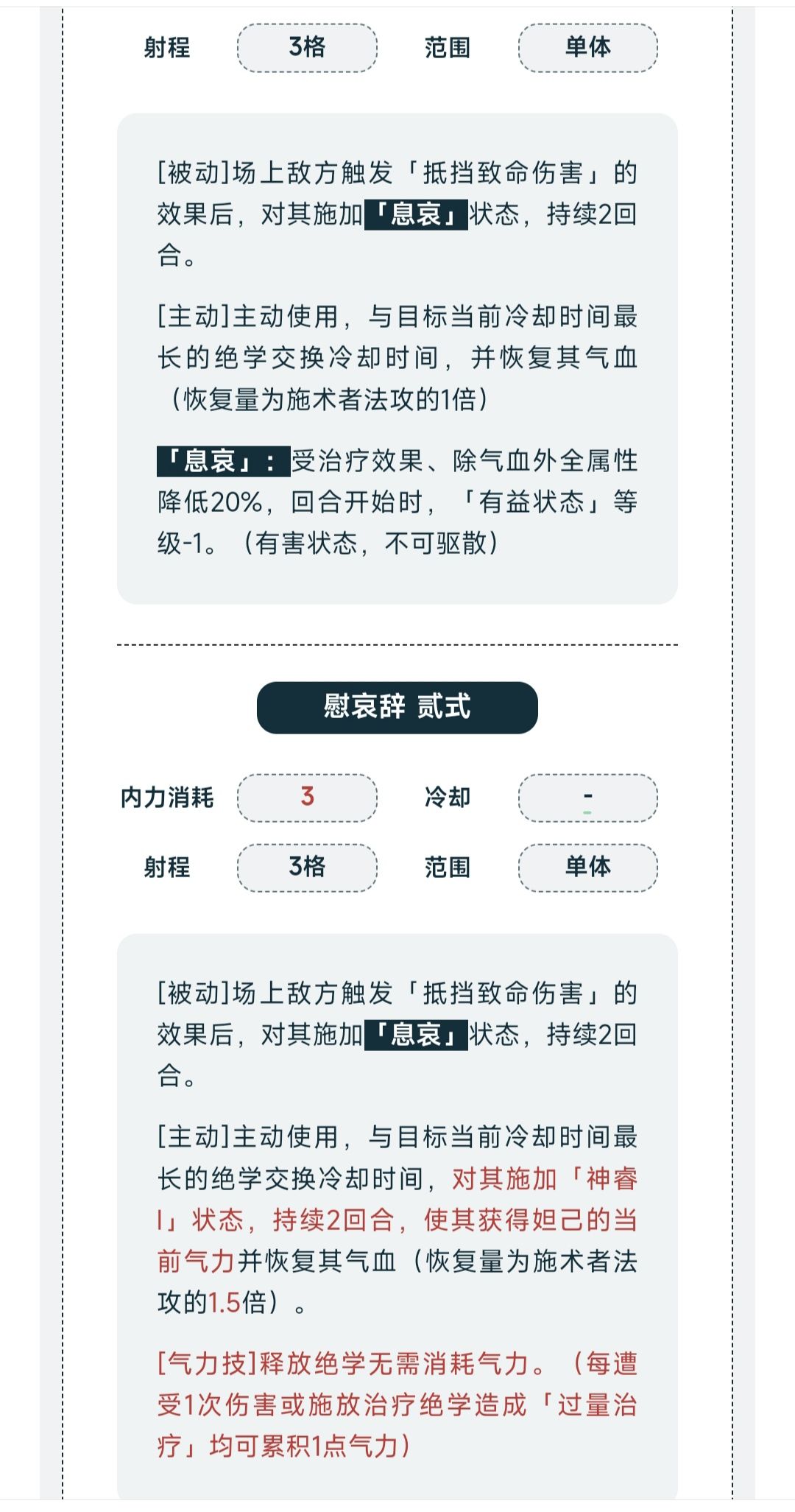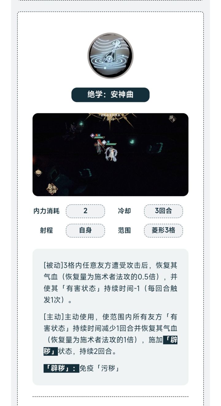 。安神曲被动对非逆阙强,对造成伤害后再上的有害不能减回合,主动技减一回合有害再奶没驱散。还有个单奶换cd技能,选择目标只写目标,不写明敌方或友方,妲己没阵,感觉上限高下限也低。