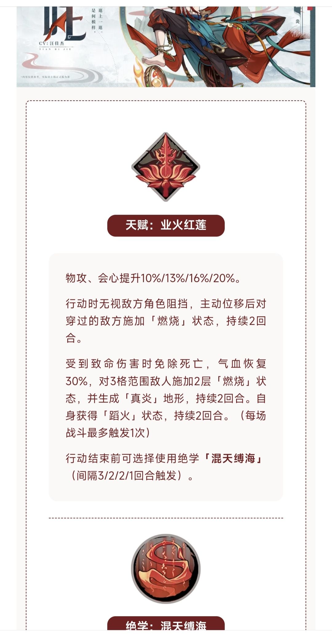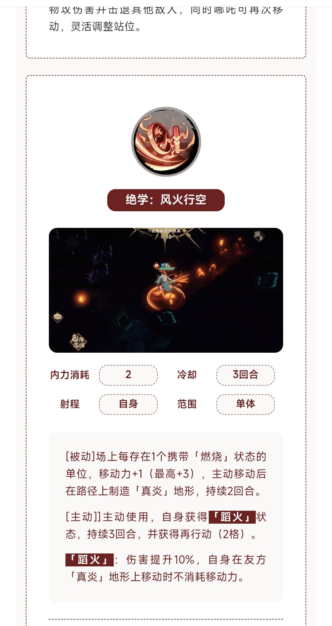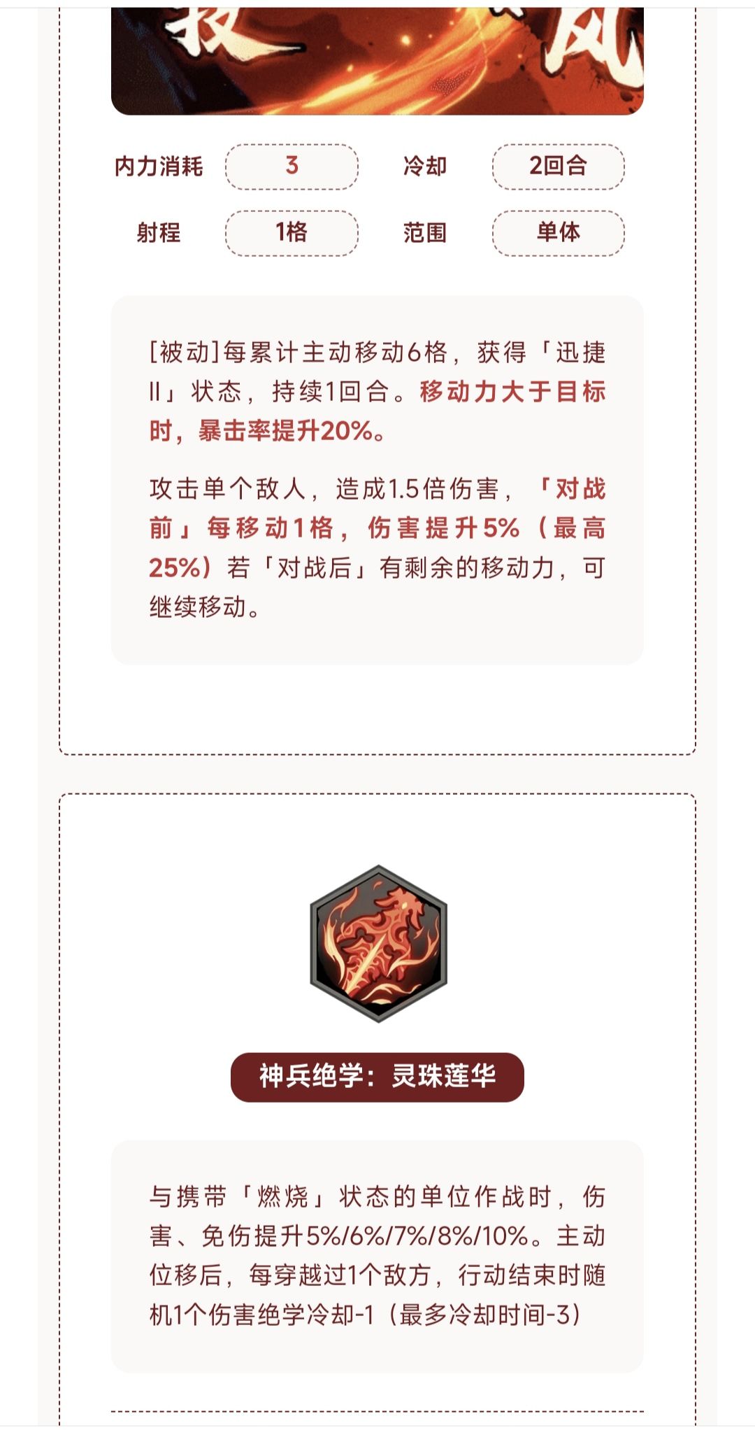 天赋无视角色阻挡,位移后上燃烧,有两命,还有个1cd对单上绫缚无法移动状态。再动技被动移动后造真炎地形,主动获得蹈火状态。还有个1倍aoe技能,加绫缚1回合持续时间战后再移动2格。还有个0.5倍上燃烧aoe,对绫缚敌方额外造成0.4倍伤害并击退2格。神兵行动结束时减cd(包含再移动),也就是说一个行动回合最多减3回合cd。不知道穿过3个敌方是随机减一次3回合的cd还是随机减3次1回合的cd