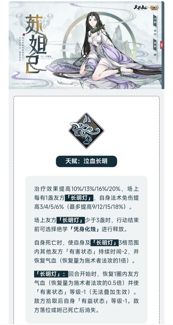 行动结束可布置灯,灯回合开始奶友方,灯消失时减妲己cd,基本上3回合后每回合可以减一次cd。妲己献祭可先范围减2回合有害再奶,献祭天赋挺强的