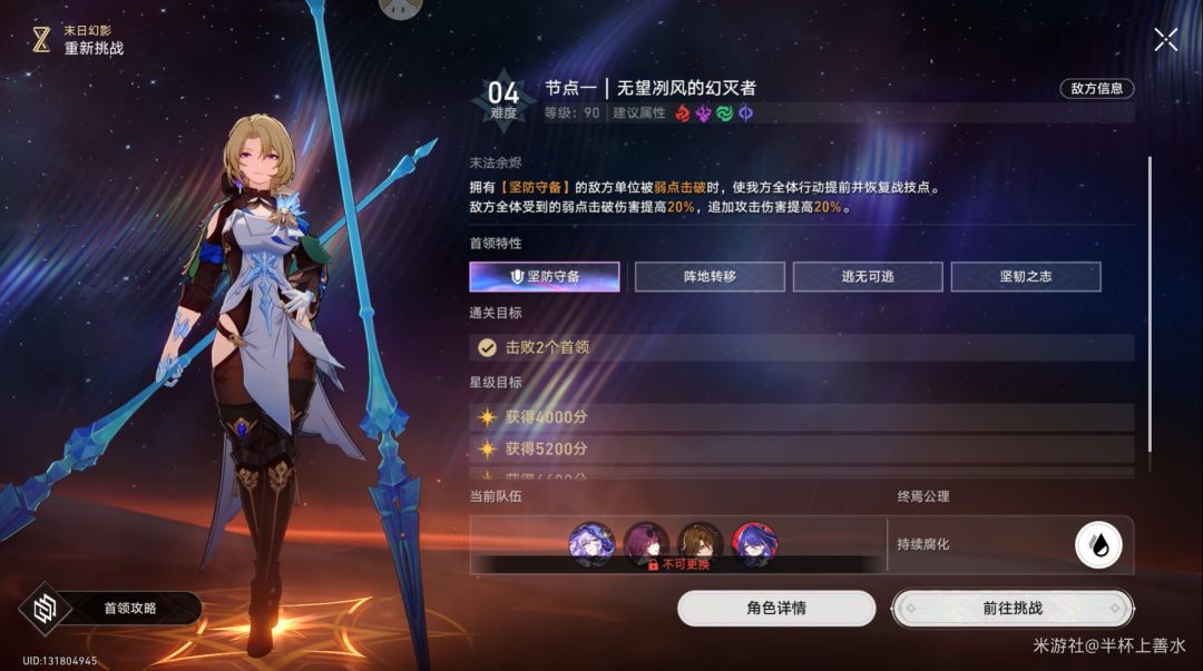 坚防守备:首领幻影受到的伤害降低50%。弱点击破后,行动额外延后,受到的伤害提高100%。阵地转移首领幻影召唤2个冰锋协助战斗(二阶段是4个无尽寒冬之槊)。首领幻影会将自身弱点属性传递给召唤物,但当召唤物被消灭时,自身韧性值受到额外削减。--转移:将弱点属性转移给目标,弱点属性会在目标被消灭后返回,并造成额外韧性值削减。一阶段召唤物: