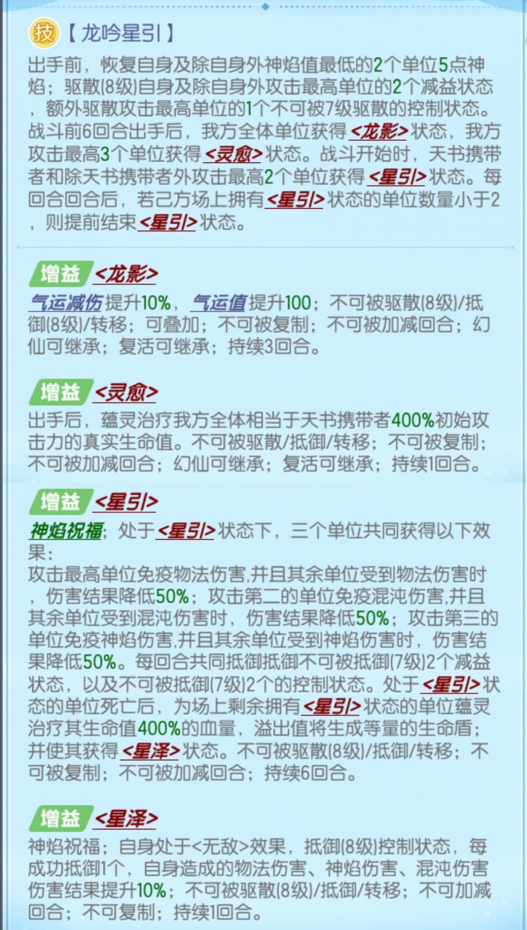 (1)、这小作文一般的字数,哪怕完全看不懂技能,也能知道这强度爆表,就不说太多了,重点说下星引、星泽。