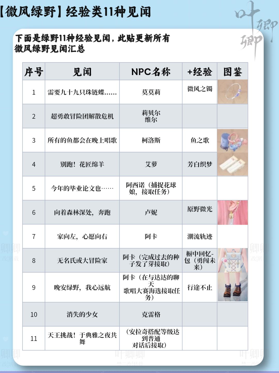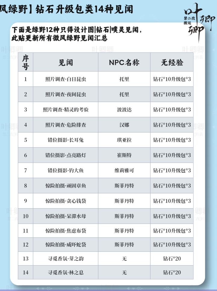 【微风绿野】31种全部见闻汇总 |完结所有的微风绿野见闻 这两天把花愿镇¦小石树¦无人区¦祈愿森林所有的见闻汇总表完结 那么见闻分成了经验类+点亮灵感【不给经验类】 进度汇报: 1.点亮灵感全图设计图纸已经完结【需要可见主页】 2.除花愿镇其余所有设计图图纸宝箱已完结【花愿镇电脑丢失了一部分还在核对整理中】 3.完结采集所有资源点位 后续计划 1.更噗灵怪位置 2.怪物点位 3.待补充【想看什么也可在下方告诉我】 【微风绿野】31种全部见闻汇总 |完结所有的微风绿野见闻这两天把花愿镇¦小石树¦无人区¦祈愿森林所有的见闻汇总表完结那么见闻分成了经验类+点亮灵感【不给经验类】进度汇报: 1.点亮灵感全图设计图纸已经完结【需要可见主页】 2.除花愿镇其余所有设计图图纸宝箱已完结【花愿镇电脑丢失了一部分还在核对整理中】 3.完结采集所有资源点位后续计划 1.更噗灵怪位置 2.怪物点位 3.待补充【想看什么也可在下方告诉我】#无限暖暖全球公测 #无限暖暖鸭梨没压力团 #无限暖暖攻略 #无限暖暖见闻任务