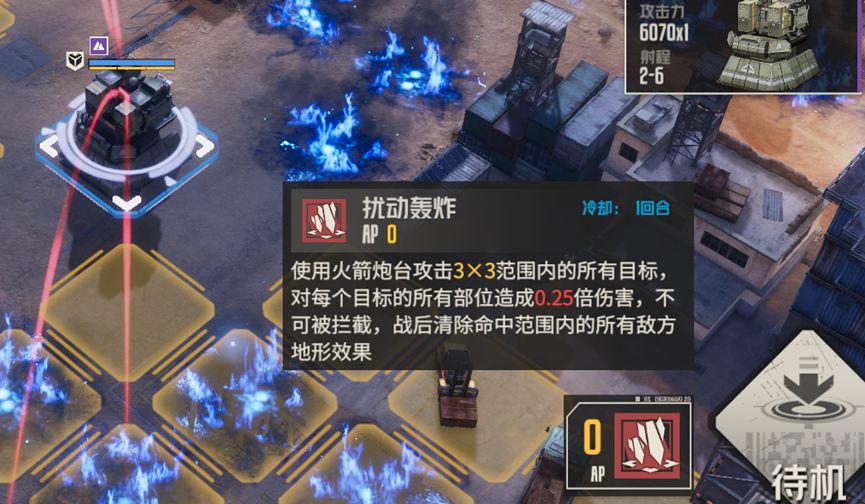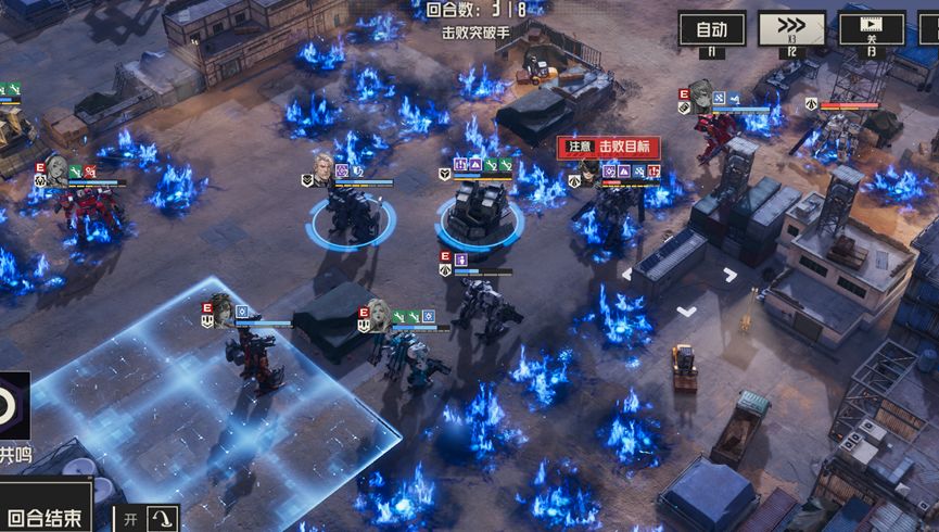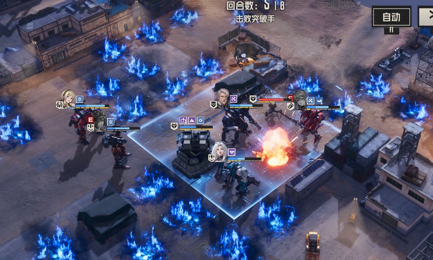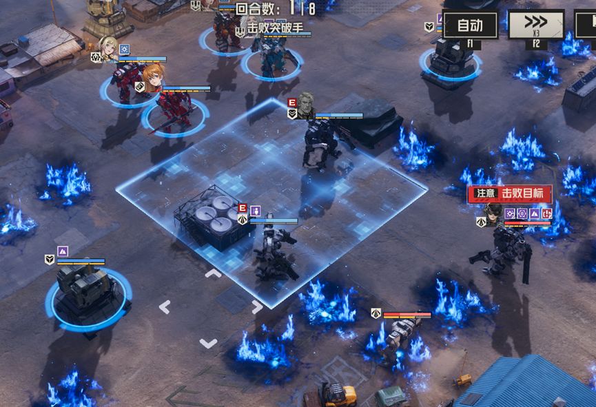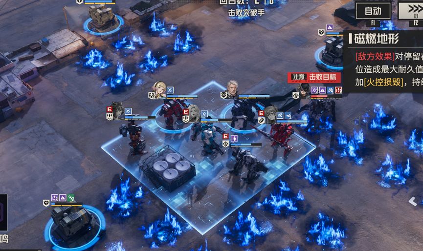 然后本关有一种新的地形机制——磁燃地形,同时具有燃烧地形和电泳地形的效果,这种地形还会给boss提供耐久回复效果,但是好在这种地形优先级并不高,所以我们可以用提费斯的战略领域直接将其覆盖,也可以用本关提供的火箭炮台进行清除,但是需要注意轮换使用,因为都有1回合cd