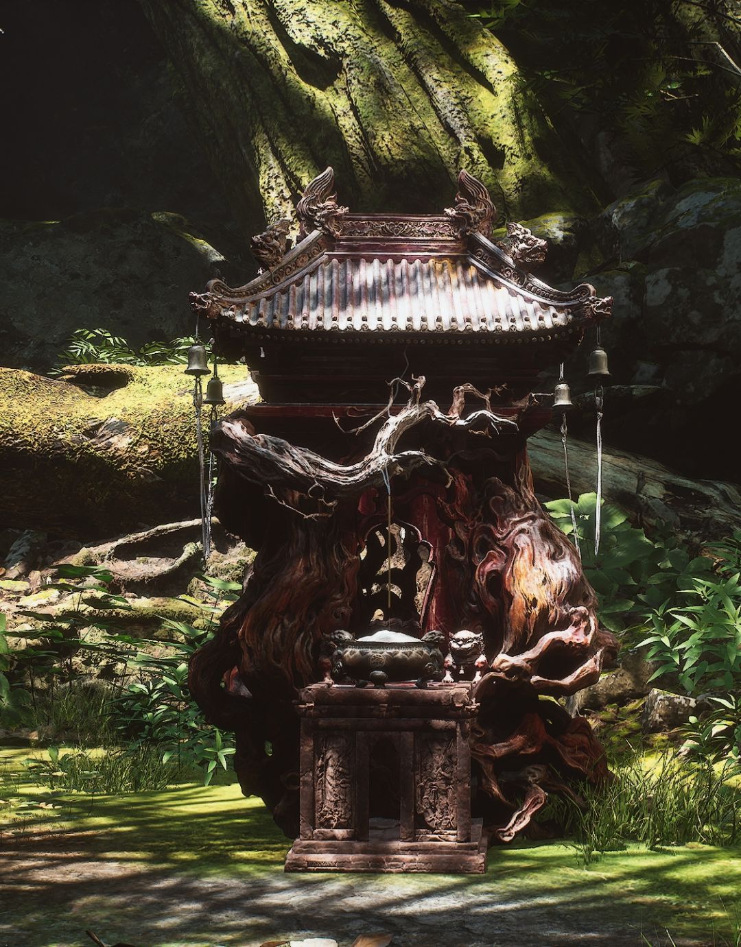 先是棕色的根瘤包裹住土地庙的下半部分,几乎让人看不出原本的材质