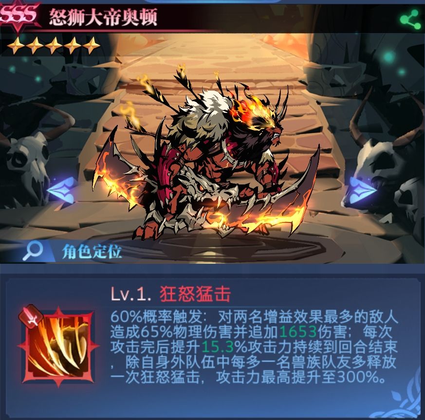 兽族队友越多,刀数越多,推图最多可以上五个兽族,所以怒狮每次出手都是5刀,一刀比一刀伤害高,即使兽族队友死了也不影响出手次数。所以思路一下就清晰了,上兽族就完事了。