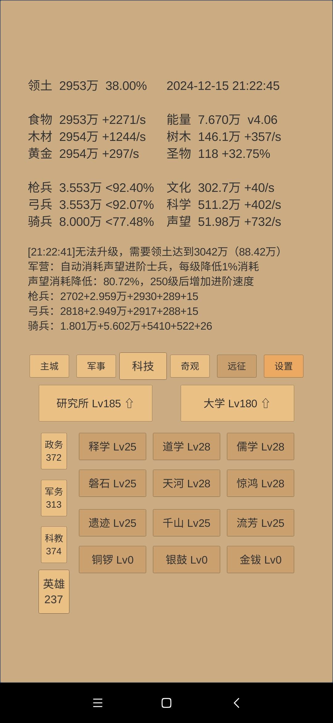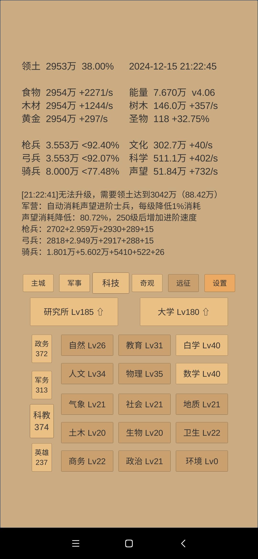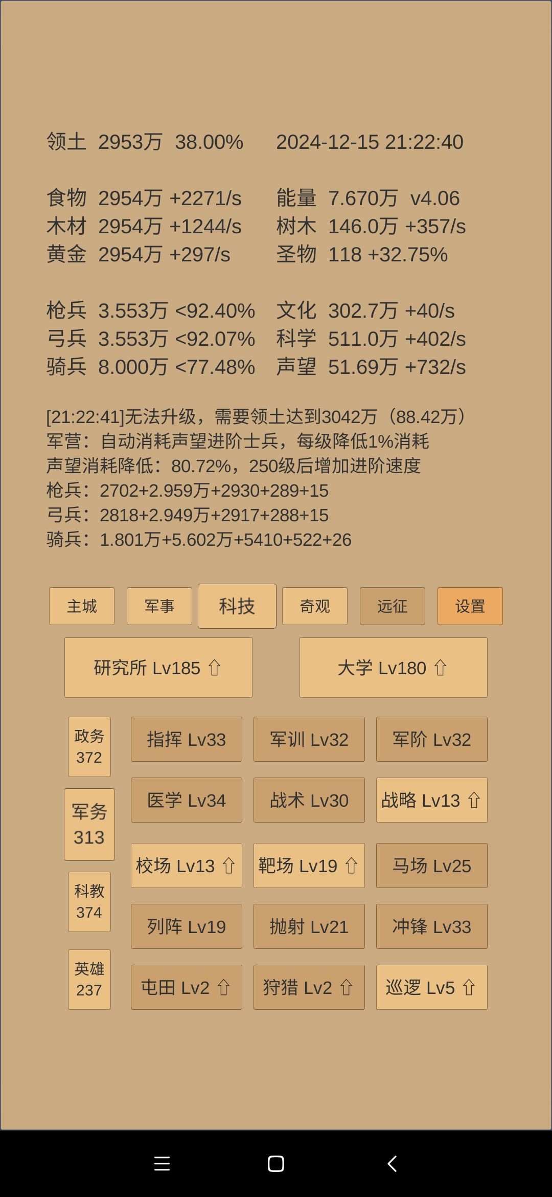 科技方面:考古和神学到40级,指挥、军训、军阶到40级