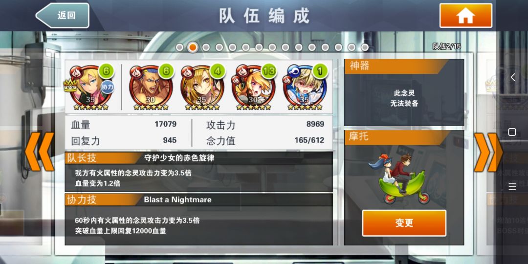 编队如图,红音队长,队员上一号位buff,三号位四号位都是连射,二号位是空余卡位,带跳啊t卡啊或者再来个输出都可以,如果是炎虎buff就是带孤儿。事实上复仇打索尔不太好用(都是彩珠cd长的复仇转不快),索尔防御力很微妙复仇打起来伤害未必有露娜高。,所以如果没有双三技+露娜的话可以带buff+双炮负责过墙。