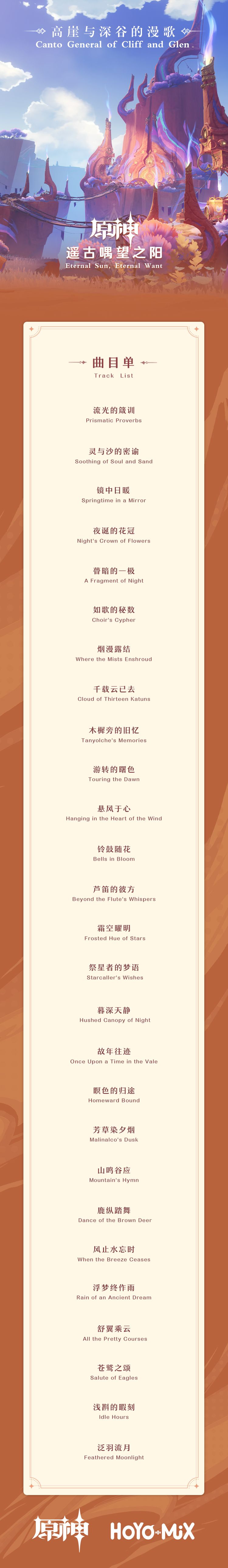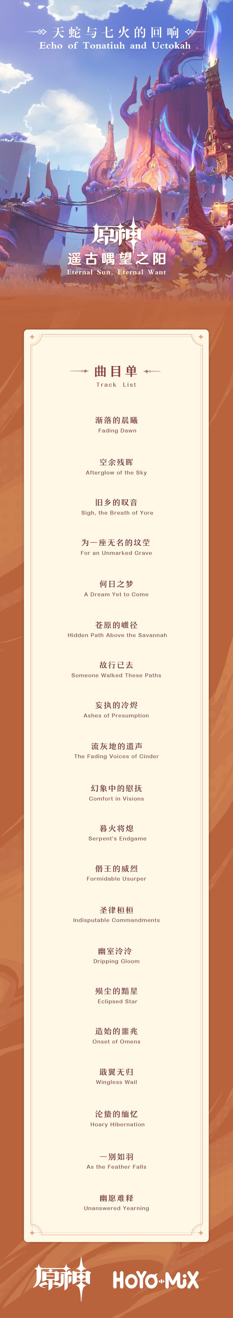 专辑分为《高崖与深谷的漫歌 Canto General of Cliff and Glen》、《天蛇与七火的回响 Echo of Tonatiuh and Uctokah》与《焚天的交燹 A Fiery Cross Across the Sky》3张分碟,共收录53首由HOYO-MiX音乐团队为《原神》纳塔地区创作的原声音乐。