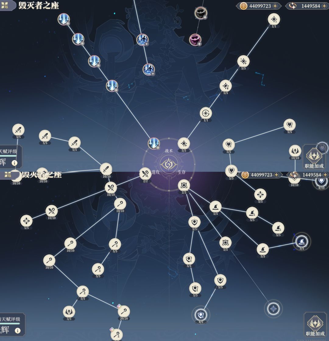 4、突袭者和毁灭的共享天赋加攻击,后期优先点起来,粉碎者加生命次之。最后点2个加防御的。
