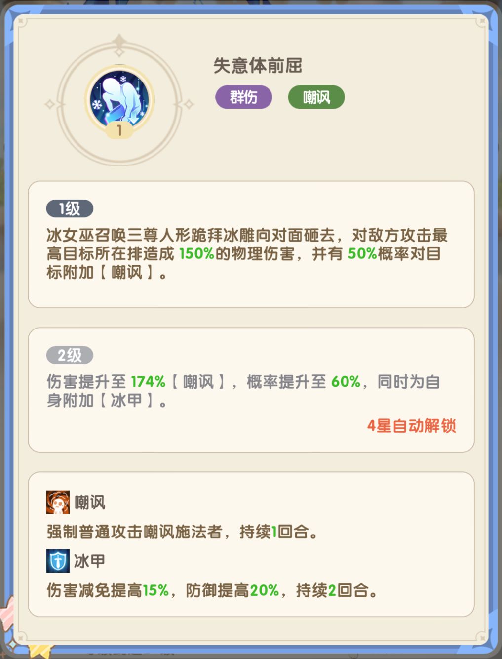 - 核心优势:作为队伍的绝对前排,冰雪女王不仅有嘲讽技能,能够吸引敌方火力,还可以降低敌人攻击力,减轻队伍的承伤压力。