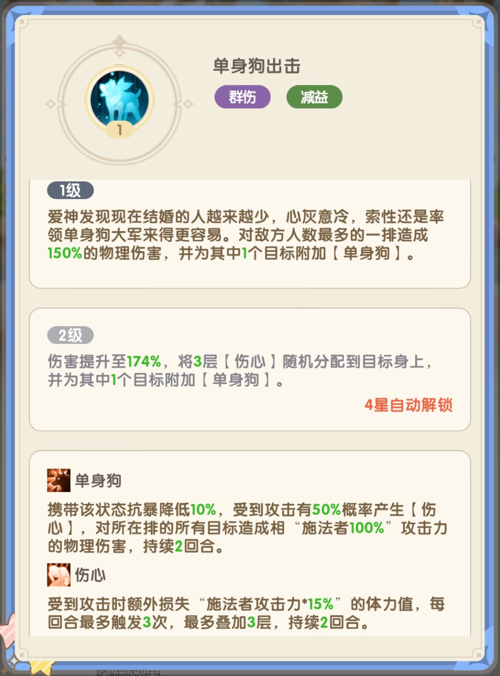 - 伤心效果:敌人受到攻击时额外损失体力,持续消耗敌方血量。