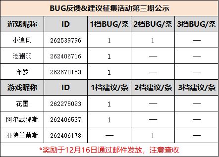 第三期建议反馈活动获奖玩家名单如下,奖励我们于12月16日通过游戏内邮件发放。