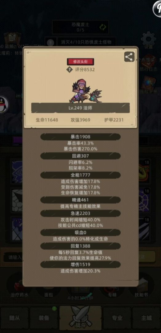 从14号到达240级开始,磨磨唧唧5天时间才把评分从6000提升到了9000,终于打通了迷雾大陆,最终通关面板如下: