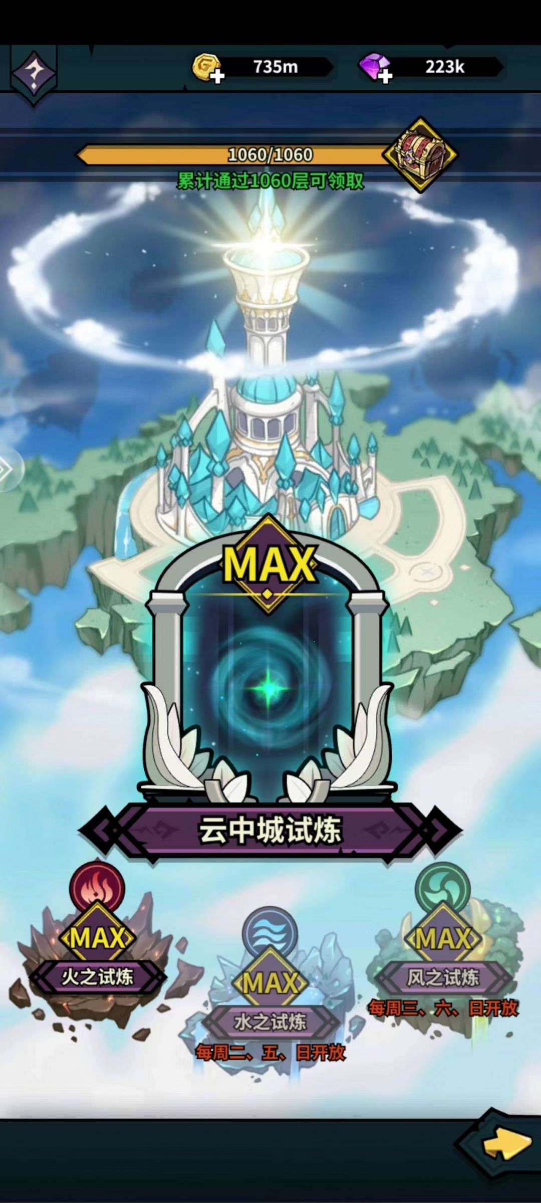 云中城试炼(综合试炼):目前上限370层,可使用全系英雄,开放时间每天,开放日挑战次数10次。