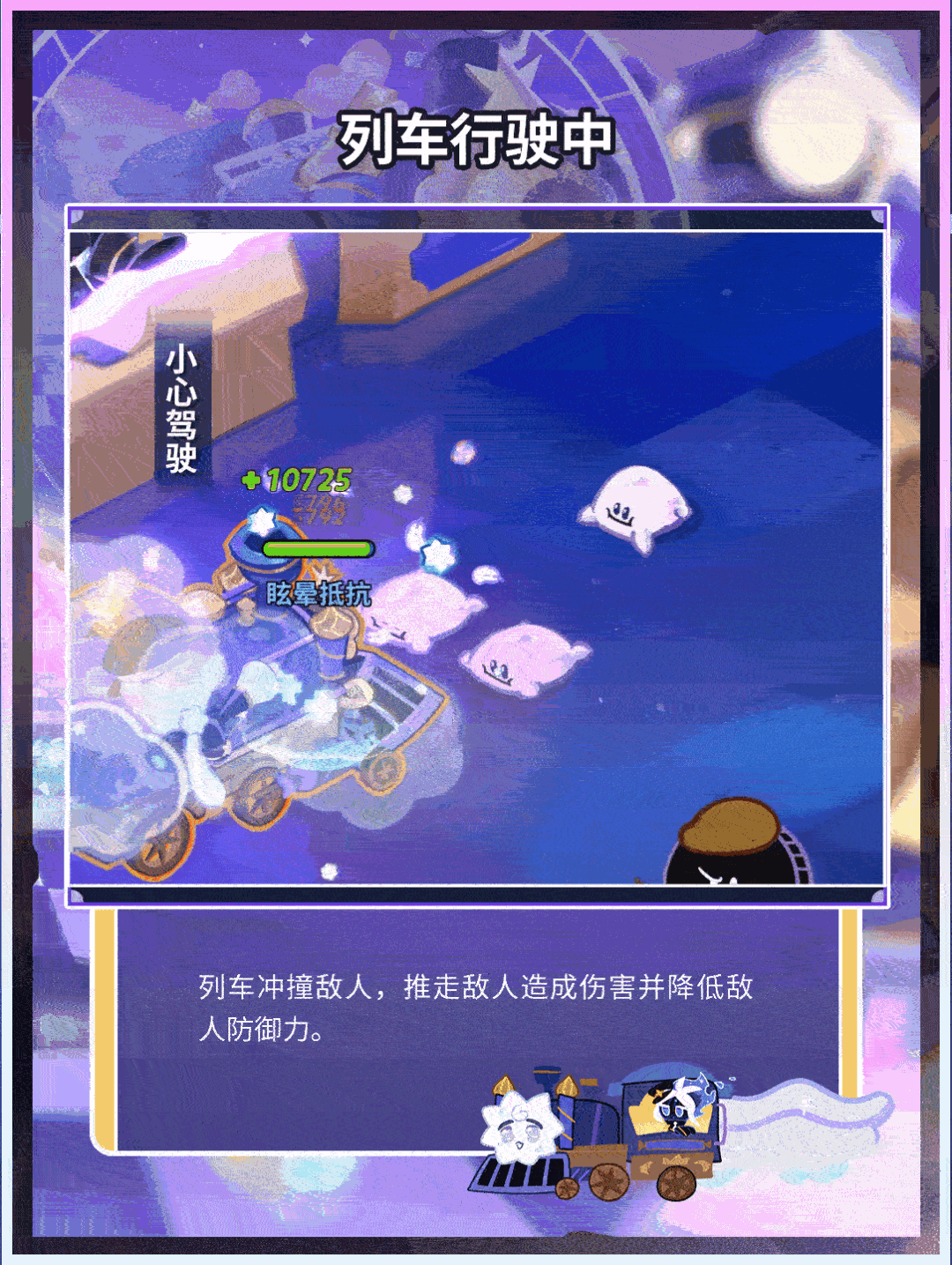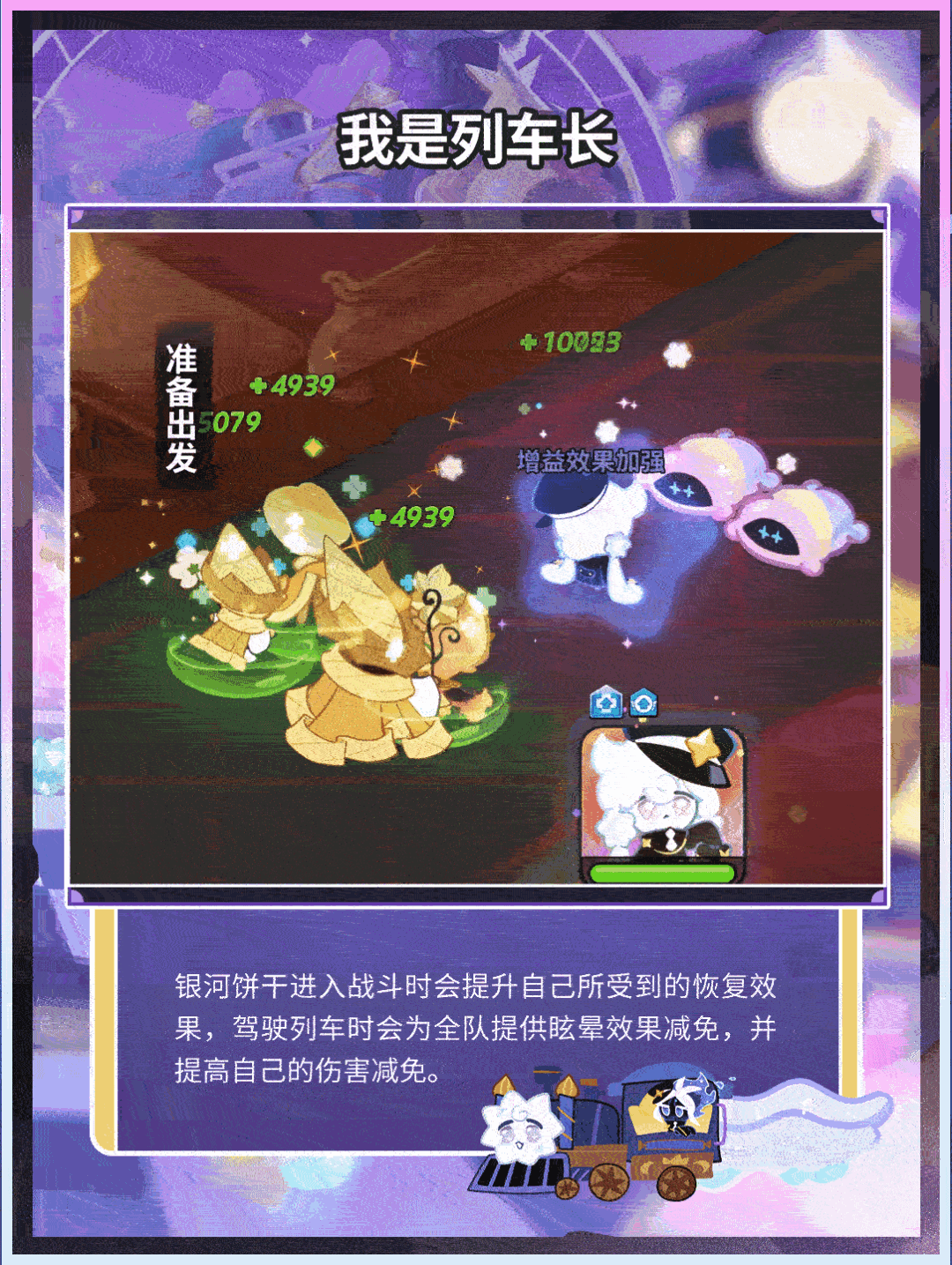 银河饼干驾驶梦之列车,为我方全体提供眩晕效果减免,并提升自身的伤害减免。列车会冲向敌人,造成伤害的同时会将敌人向后推,列车每次冲撞都会降低敌人的防御力。当列车停止行动后会基于银河饼干的最大生命值来为我方全体提供生命值护盾,当银河饼干进入战斗时,会提升自己所受到的恢复效果。