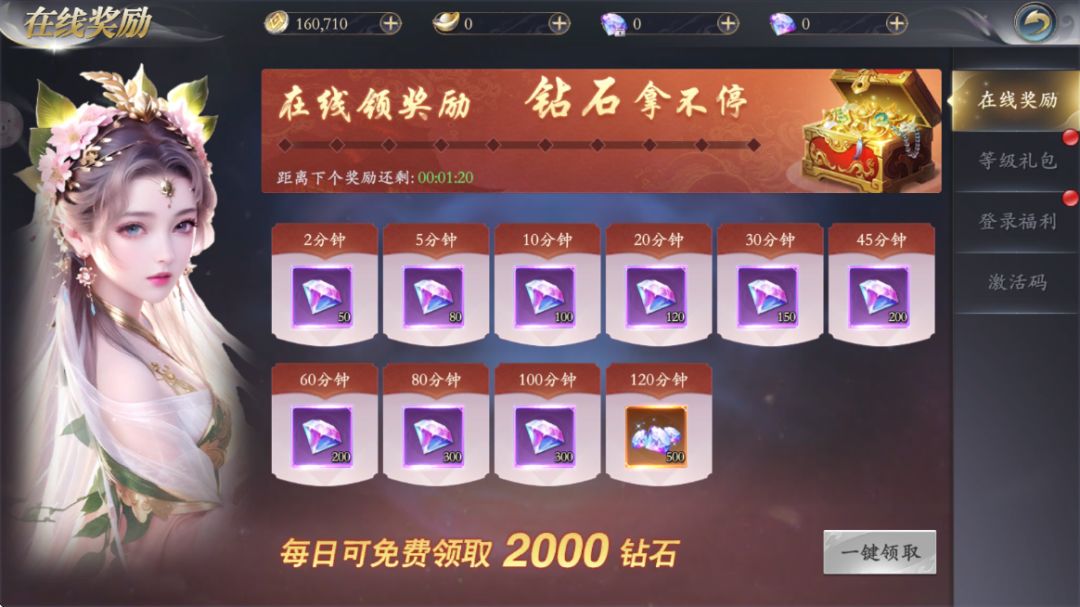 福利一:开测福利大放送,每天累计登录120分钟免费领取2000钻石