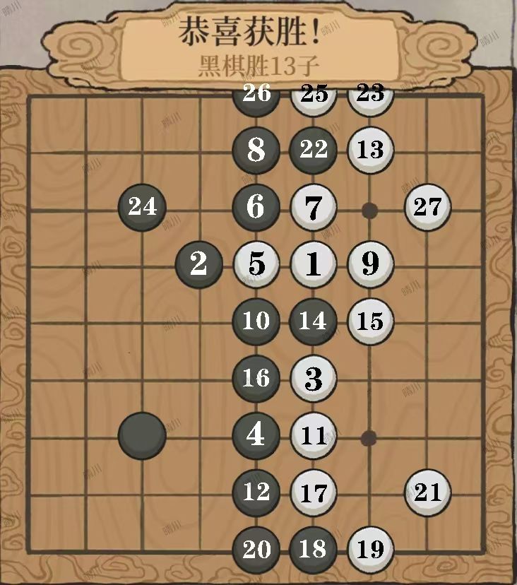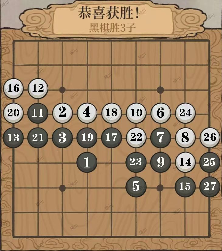 3.对局难度分为四档:曲征(简单-让6子)、李星罗(中等-让4子)、卫弈(困难-让2子)、大国手(极难-执白不让子)。完成高难度对局胜利后不会再出现低级难度的对局。