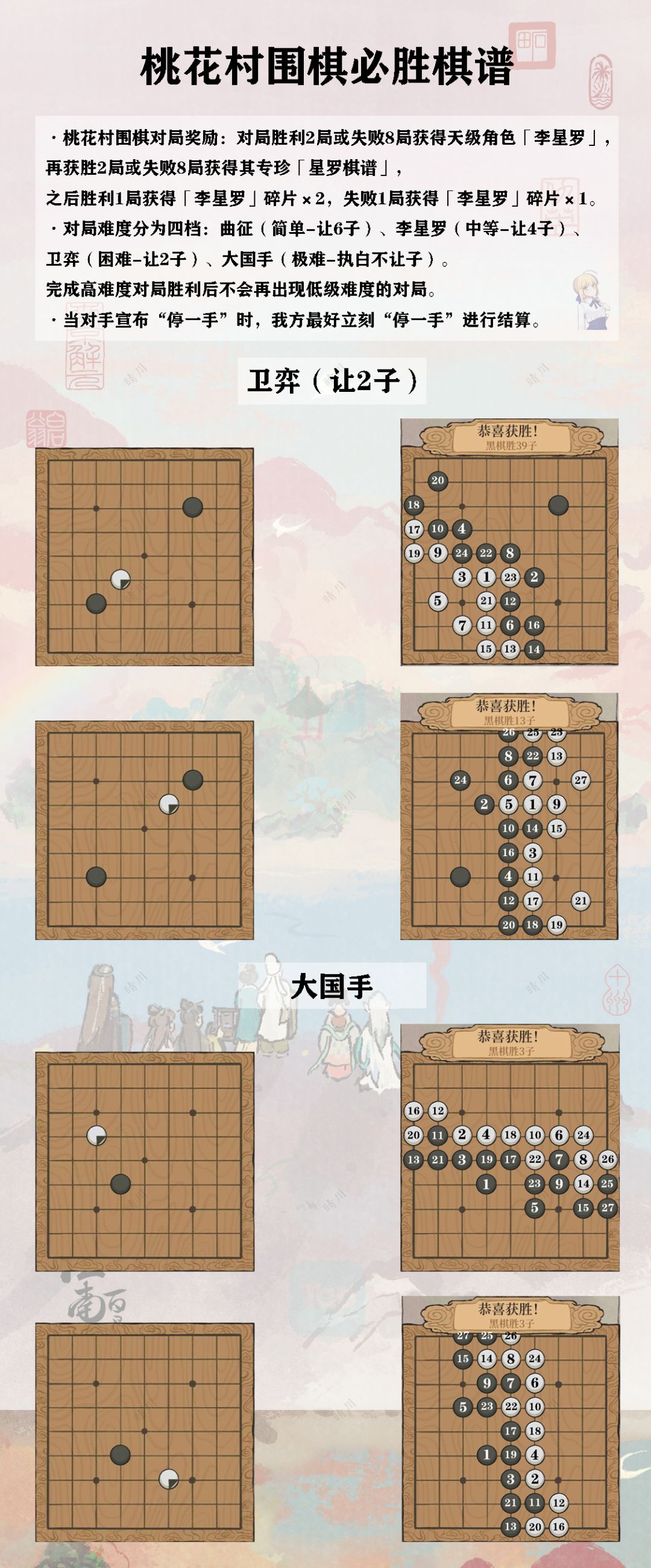 2.桃花村围棋对局奖励:对局胜利2局或失败8局获得天级角色「李星罗」,再获胜2局或失败8局获得其专珍「星罗棋谱」,之后胜利1局获得「李星罗」碎片×2,失败1局获得「李星罗」碎片×1。