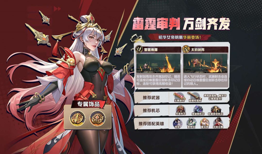 届时我们将迎来全新英雄-明凰,明艳动人的昭华女帝华丽登场,剑灵守护,雷霆审判,可召唤飞剑斩击附有印记目标敌人!(请以游戏内实际上线为准~)