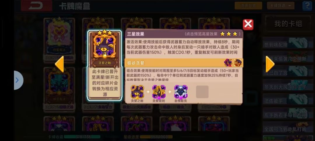 既此卡牌三星基础持续时间八秒,击败贪婪之后时间延长至18秒,释放技能后获得自动释放武器蓄力的效果。