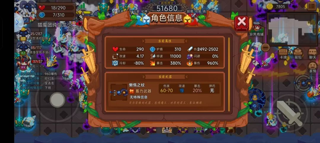 嫉妒的被动为仙魔为仙魔高分关键之一丢失一点护盾加五点武器攻击力与八点天赋伤害,仙魔的装备青铜甲极其容易做到200-300护盾你只需要把身上的青铜甲丢出再捡起,你的护盾就会变低加上刹那芳华与力量的代价进一步压低护盾你的面板就会来到一个极高的层次,如下图