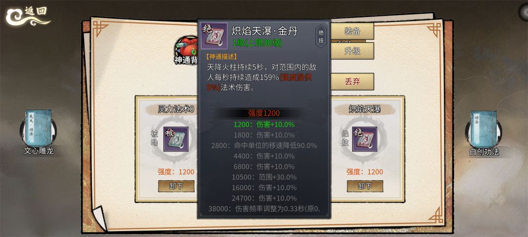 需要注意神通评分无法超过功法的评分,所以先要提升一下功法品阶,提升功法品阶需要功法品质书(在珍宝掌柜里有概率刷新出来)神通评分达到临界点会大幅度提升属性