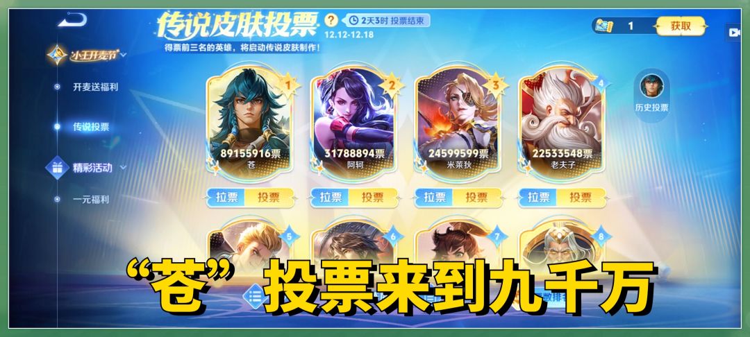 最后,在只剩下最后一天时间,在 28 个英雄的投票中,选出三个英雄出 传说新皮肤的活动里。