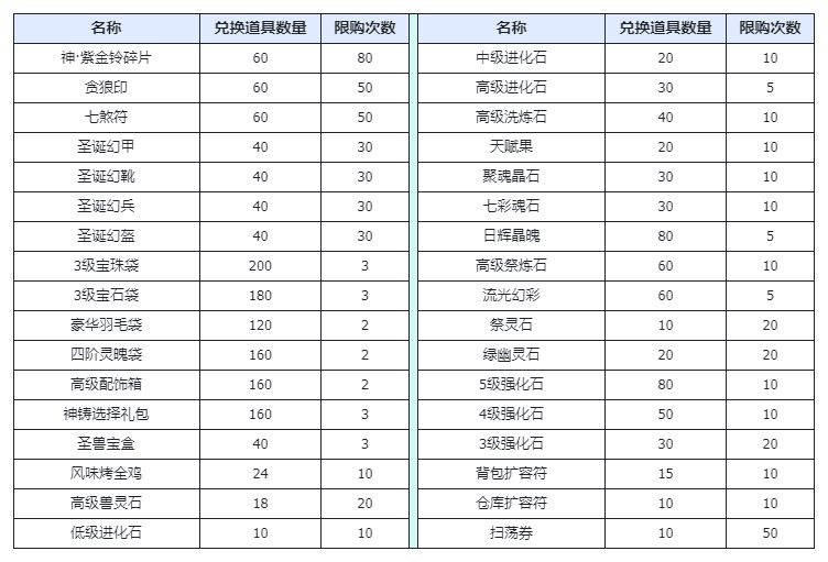 活动内容:活动期间通关东胜神州,北俱芦洲,西牛贺洲,须弥山,瑶池仙境,神雷玉府中任意一关有概率获得双旦兑换券,使用双旦兑换券可以在老板娘活动商店中兑换圣诞时装,法宝,材料等特殊物品。
