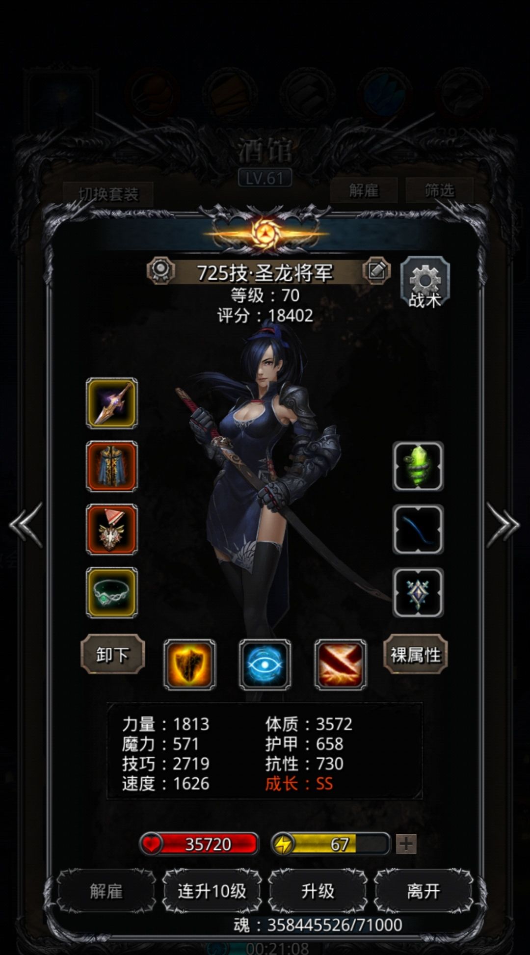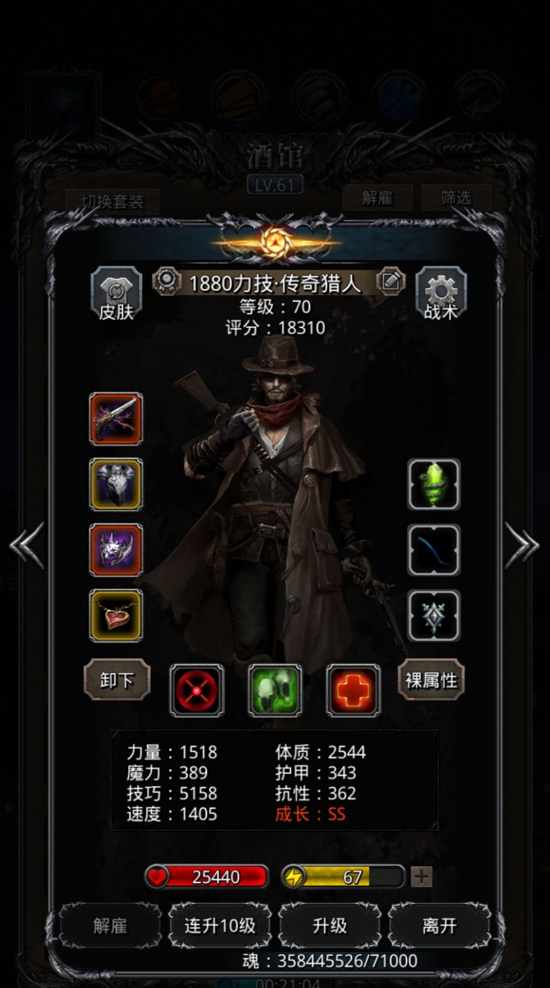 独裁传猎的冥心换遗迹11圣冠,圣龙的剑换成高技剑。装备调整后,一局输出从250W提升到320W了。(因为每天免费挑战一次,黑水晶打一次,所以耗费的黑水晶比较少,10颗左右)