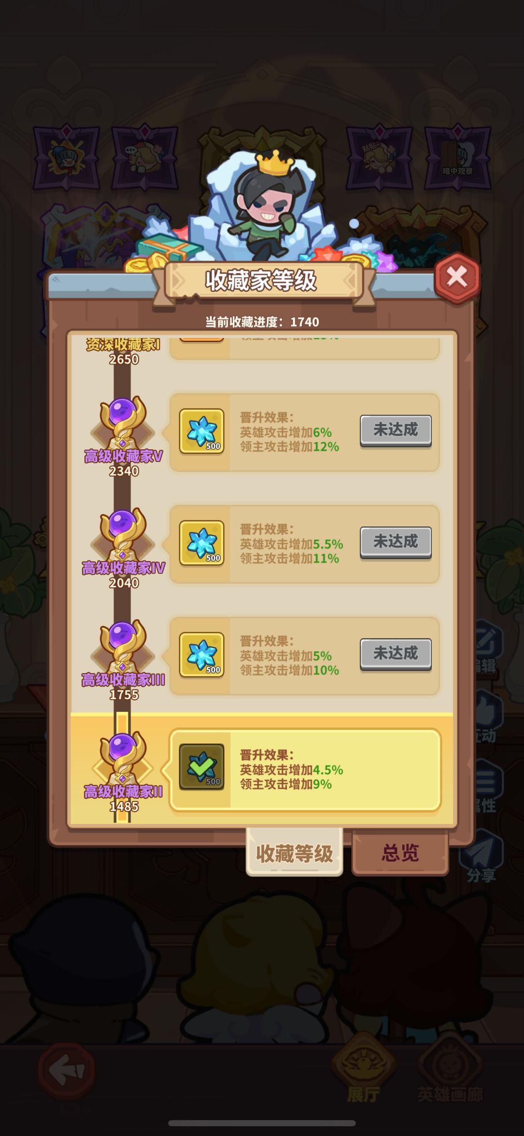 ⑤展览馆:展览馆每小段会增加全体英雄0.5%的攻击力,例如达到1755收藏分就可以增加5%的全员英雄攻击力。