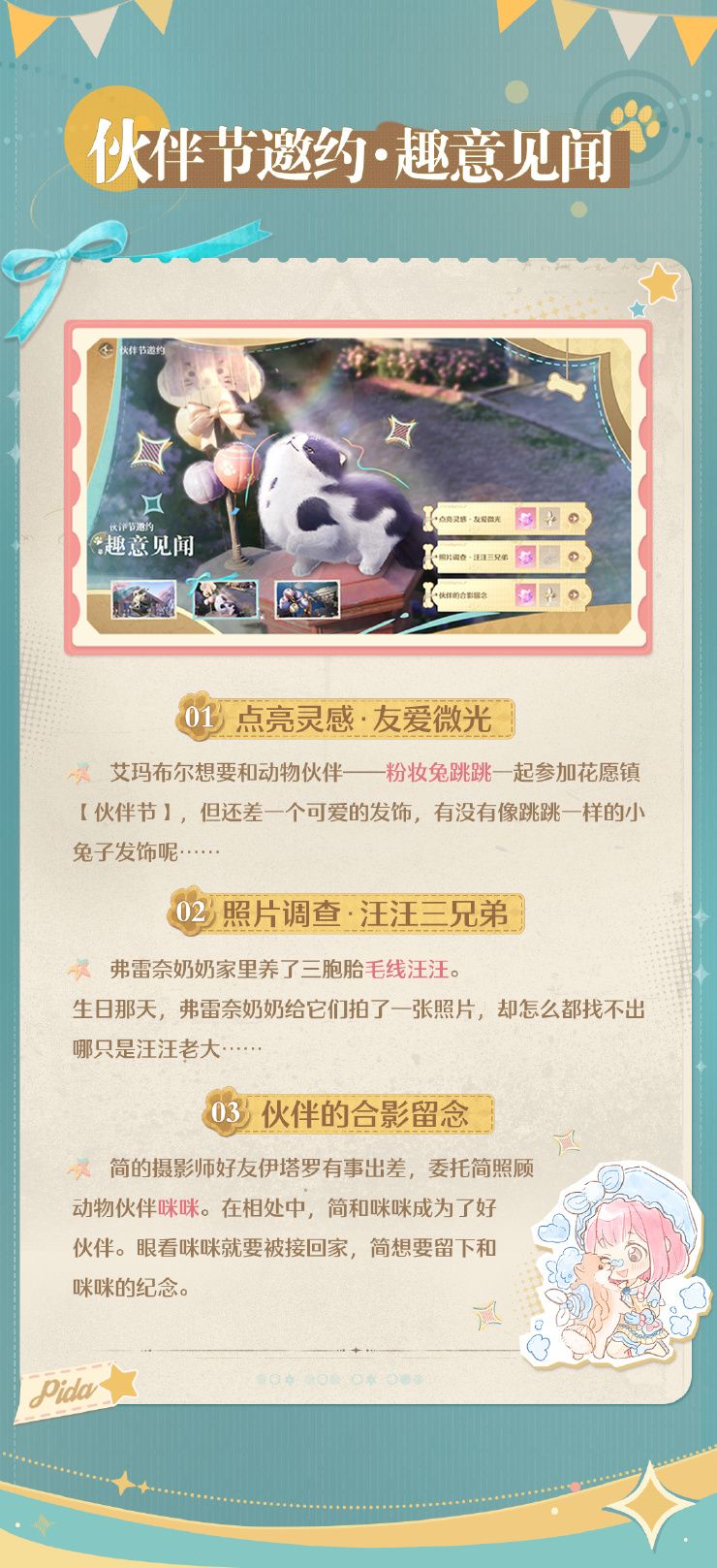 🎉1.0版本【伙伴节】活动开启为了纪念一只英勇的毛线汪汪,表达对爱与守望相助的深深敬意,花愿镇的居民们特意设立了一年一度的【伙伴节】。在这个节日里,镇民们会分享美好的故事,庆祝珍贵的伙伴关系。