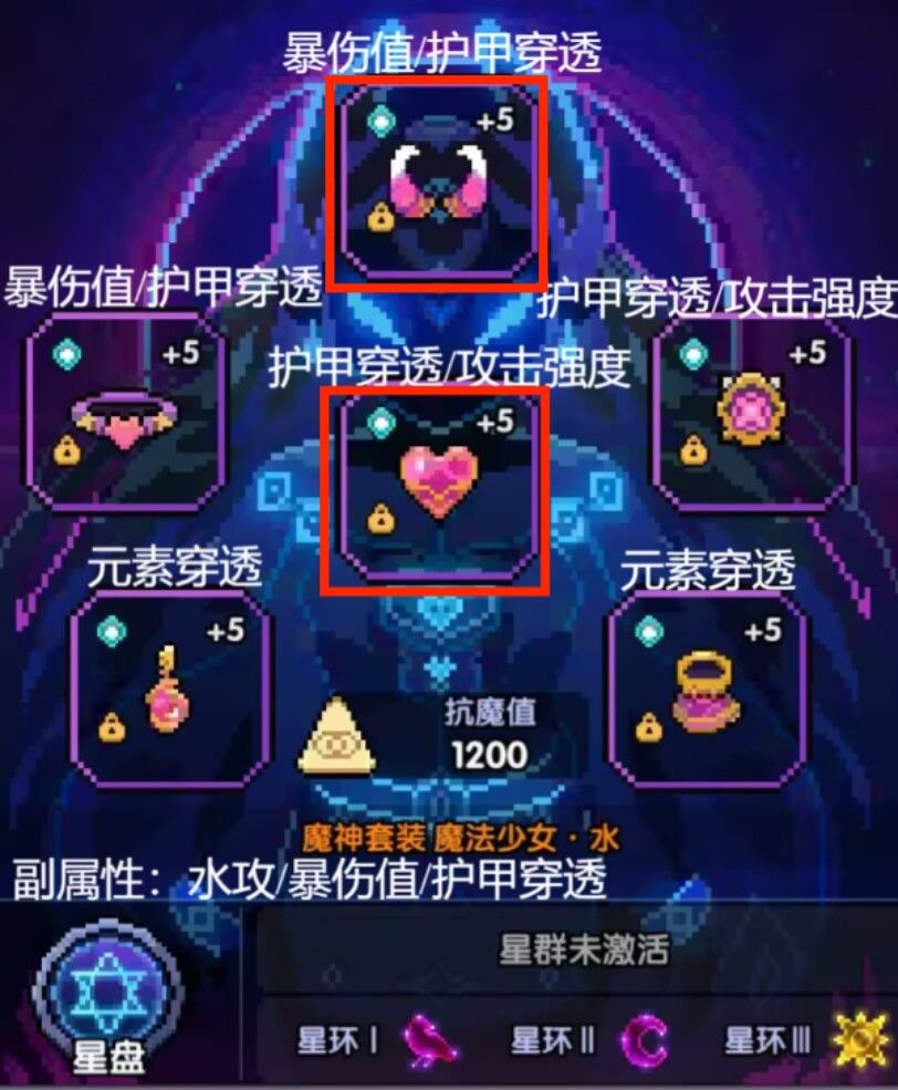 图中红框,如果自己元穿缺口过大,可以替换为一阶外装(元穿主属性)进行补充。