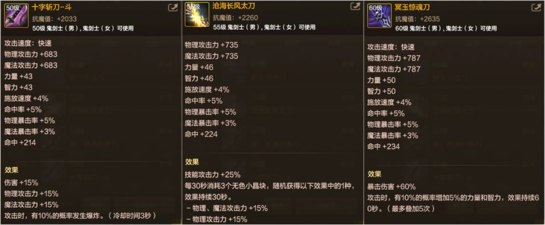 以太刀为例,55版本热门的“十字斩刀-斗”和“沧海长风太刀”,都是非常强力的存在,但在60级史诗武器面前还是欠缺了不少,基础面板和“效果”都远超50~55级史诗武器。