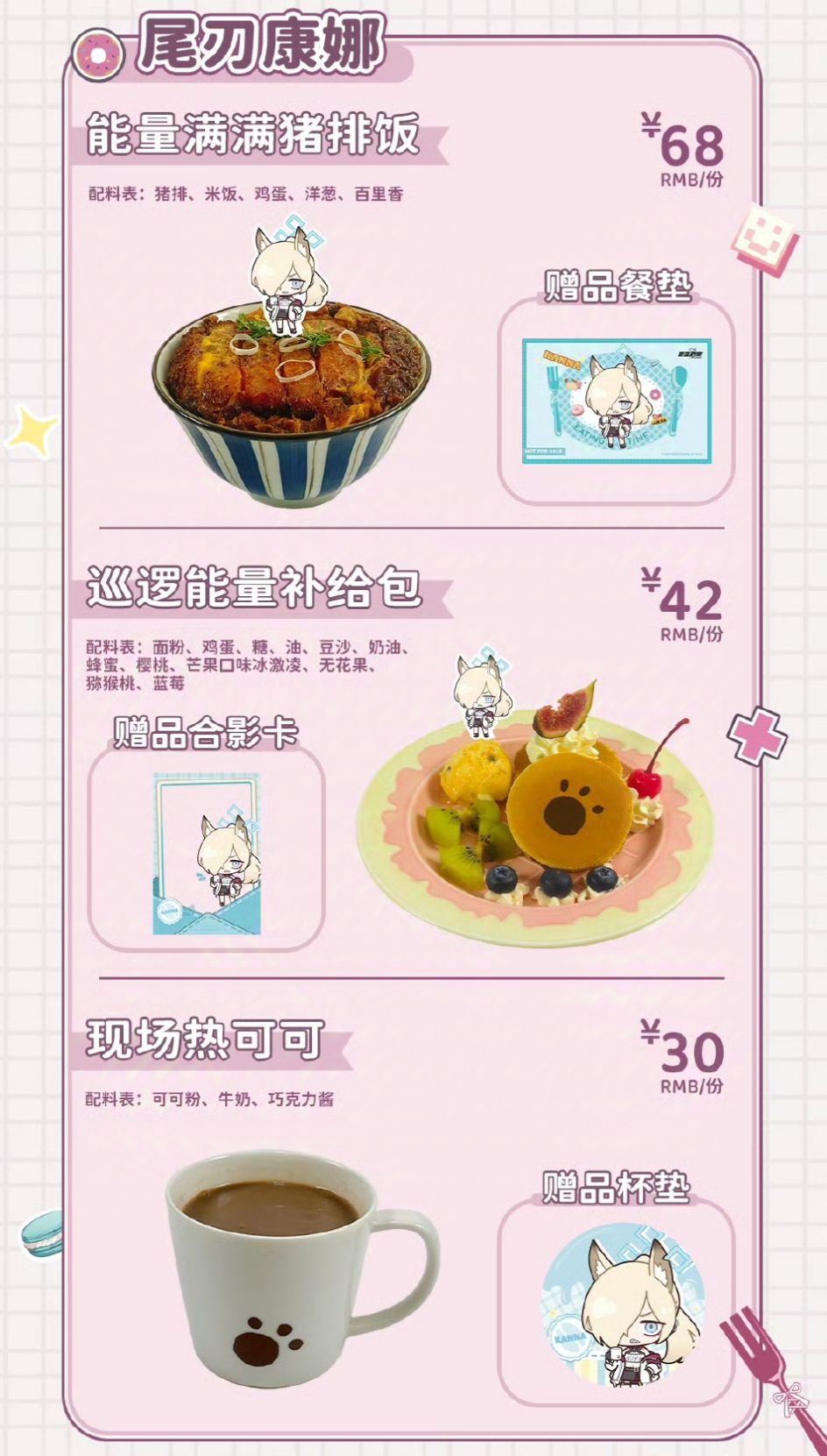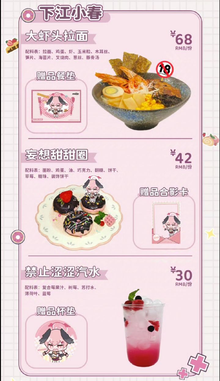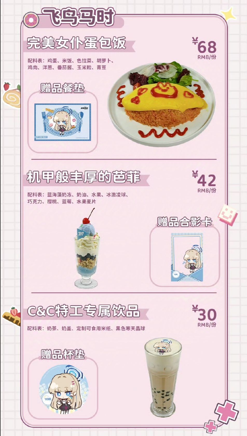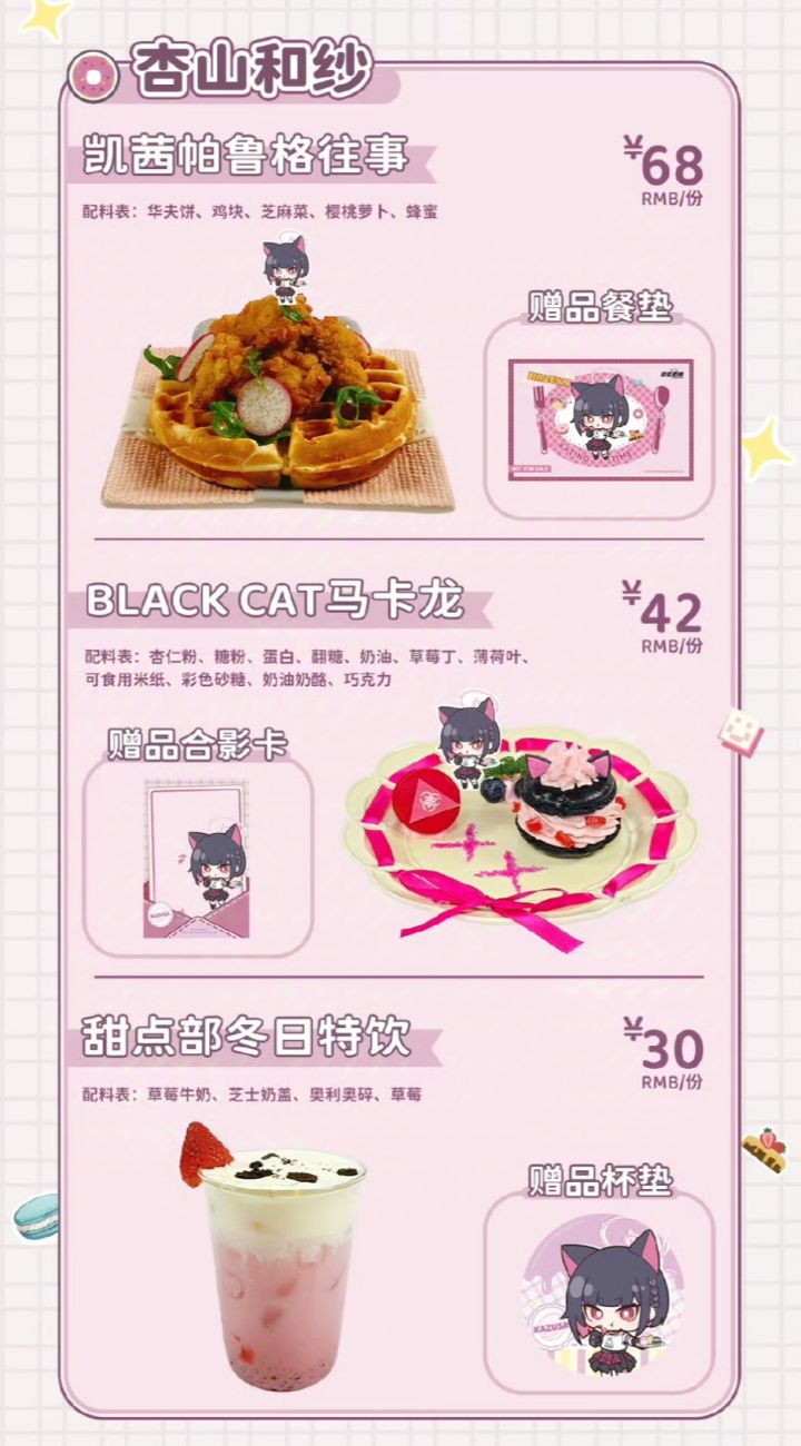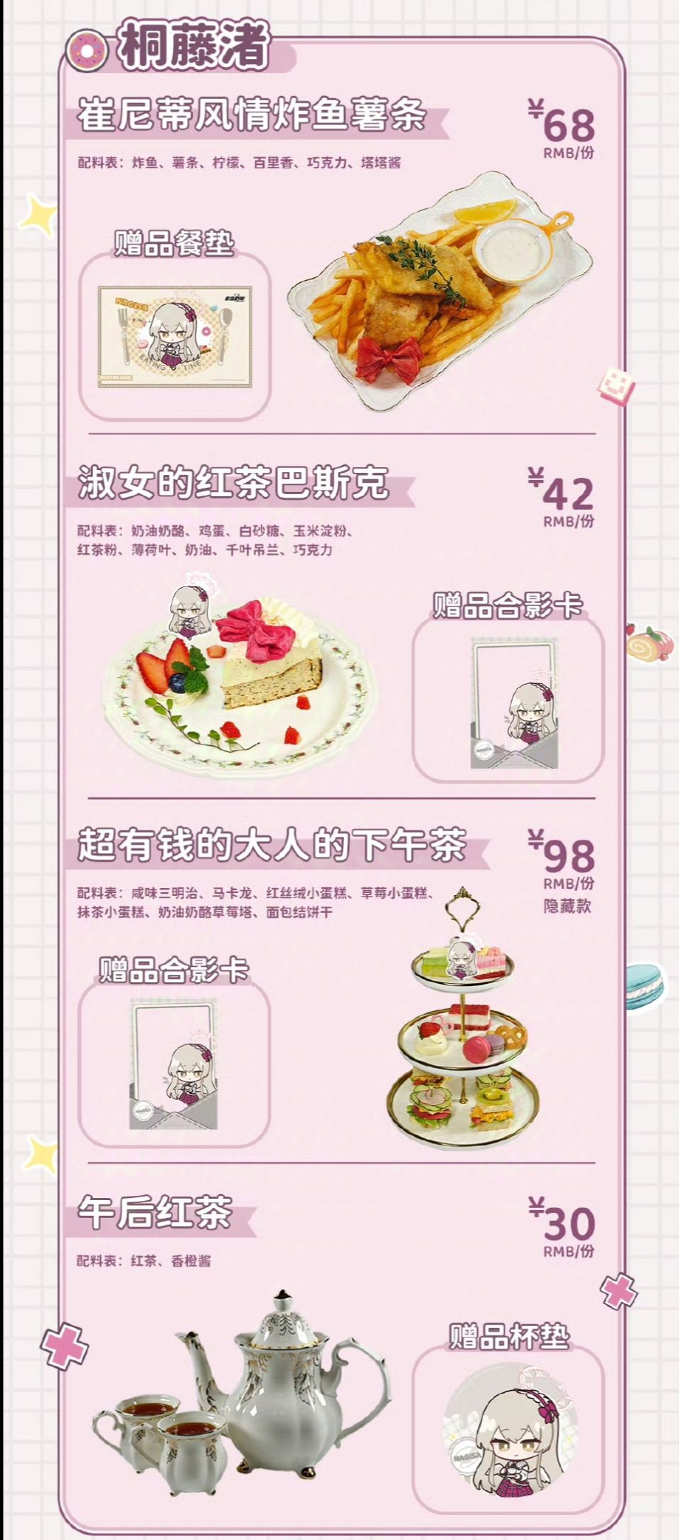 餐饮有各角色主题,角色有六个分别为:圣园未花、下江小春、杏山和纱、桐藤渚、飞鸟马时、尾刃康娜
