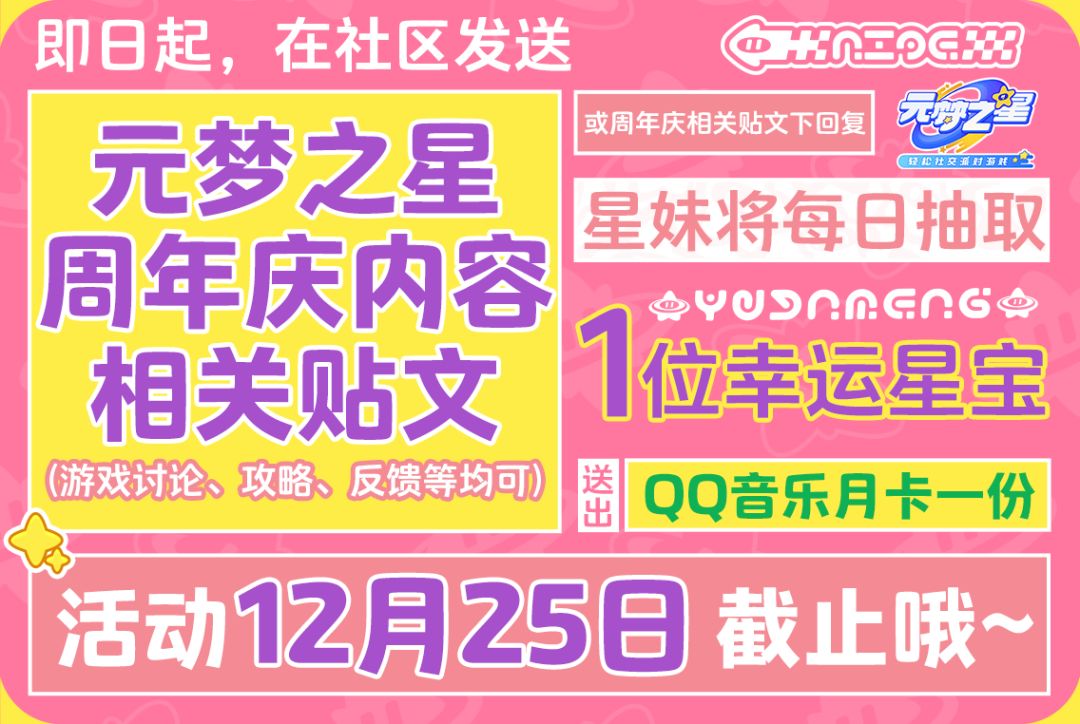 距离元梦一周年庆典只剩下4天啦!过去的一年里我们一起玩了超多模式留下了难忘的回忆,我们一起在天天晋级赛里“斗智斗勇”,在星宝农场朝着神农等级共同努力!在峡谷里并肩作战拿下最强峡谷星,在谁是狼人中“勾心斗角”成为MVP,以后,还有更多新的玩法等待我们去探索!周年庆期间,星妹还给大家准备了超多丰厚奖品等着大家领取哦,星宝们不要错过啦~让我们一起喊出:星宝们生日快乐!