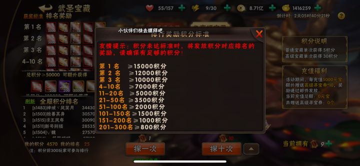 充值玩家每充值5000元宝额外获得10个高级寻宝卷,这个看你自己充的时候对比一下跨服充值来这样可以获得更多的奖励,,冲刺武圣排名时多看下额外的积分奖励,利益最大化。