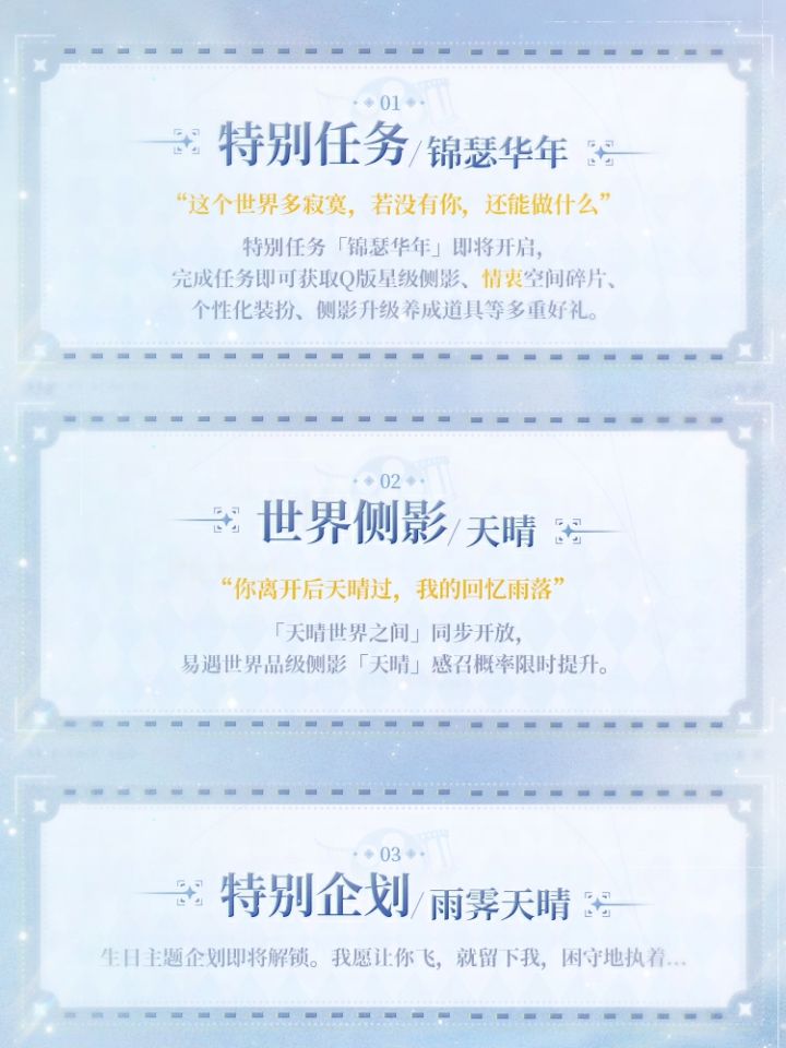 特别任务「锦瑟华年」即将开启,完成任务即可获取Q版星级侧影、情衷空间碎片、个性化装扮、侧影升级养成道具等多重好礼。