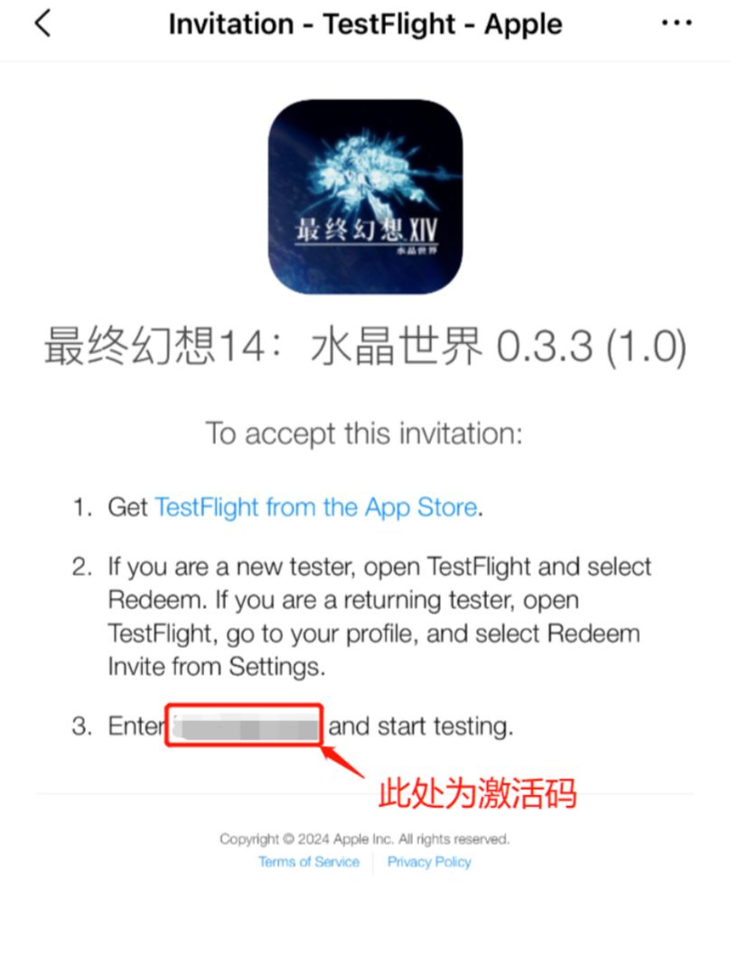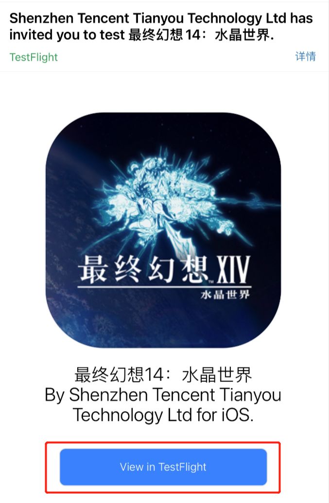- 步骤2:登录参与问卷招募时所填写的邮箱,找到TestFlight发出的“最终幻想14:水晶世界”邀请邮件,如下图所示: