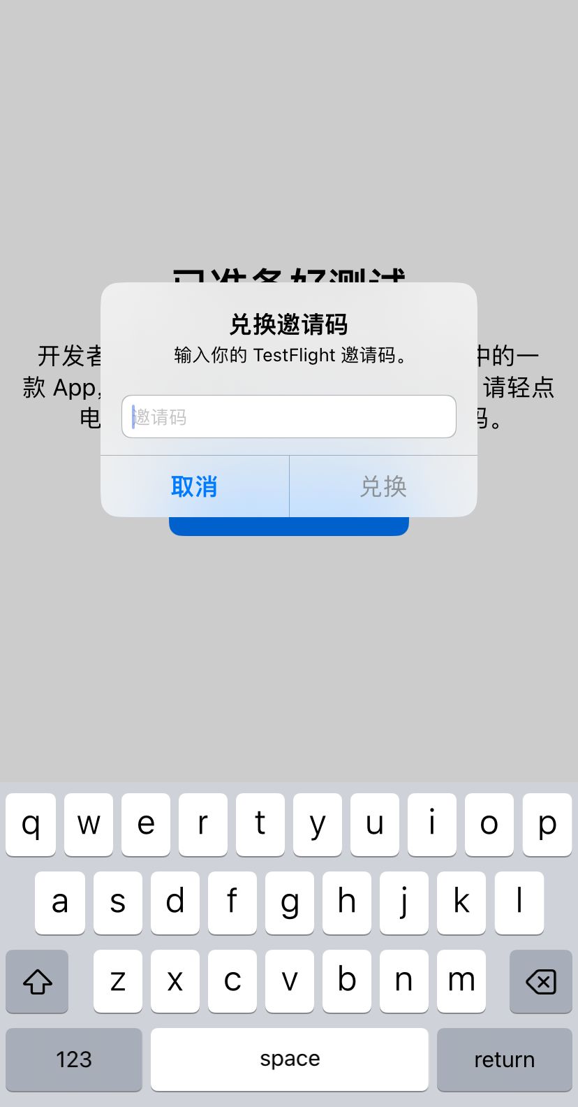 - 步骤4:回到TestFlight中,点击右上角,输入刚才获取的“邀请码”,点击“兑换”后,即可下载游戏