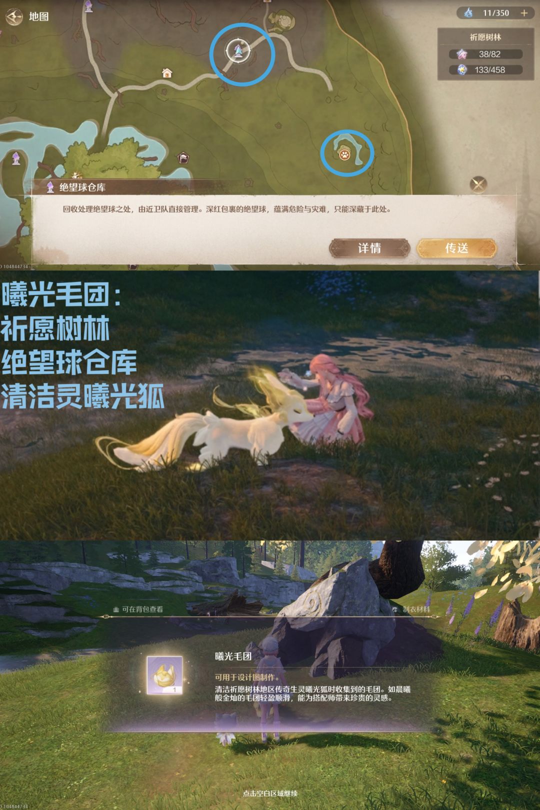 4.曦光毛团:祈愿树林——绝望球仓库——清洁灵曦光狐(先变小靠近之后再变大清洁)