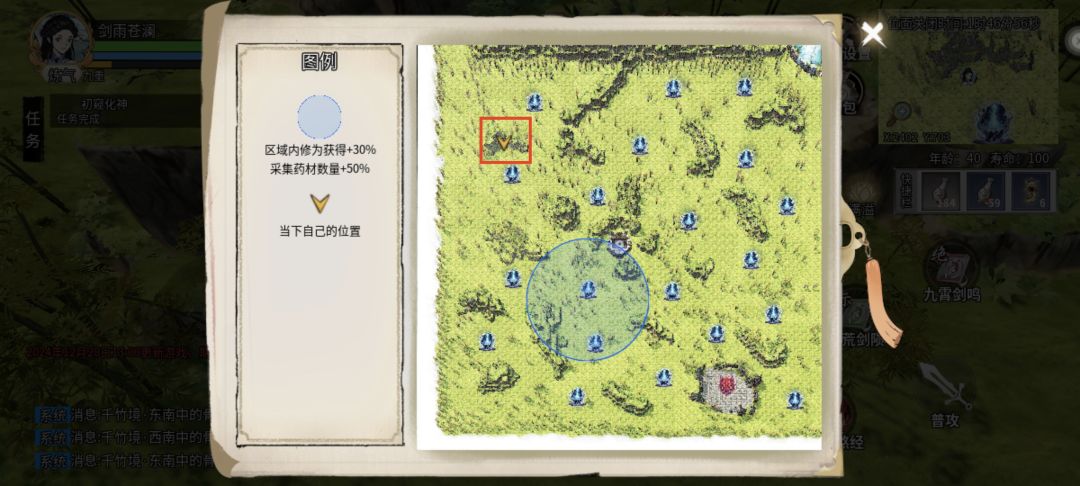 这里是练气期1图 红色框选的地方有2个药材在一起采集起来很方便 不用到处跑