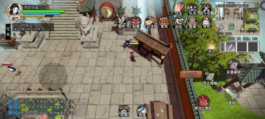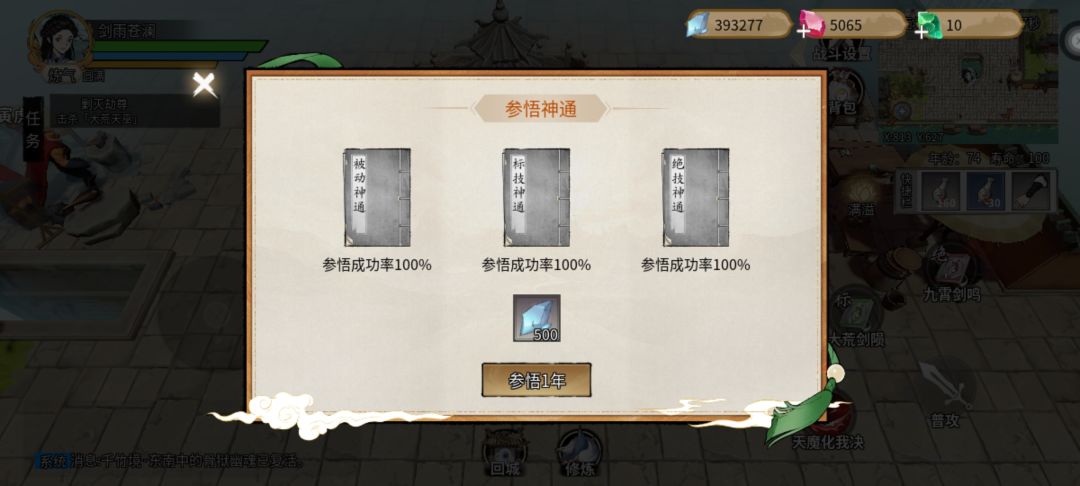 接下来是神通 也就是技能 领悟神通看你灵石够不够 新手不要追求橙色或者红色神通 因为你灵石够了,寿命不一定够用 回城后。在城市的中间参悟池进行神通领悟