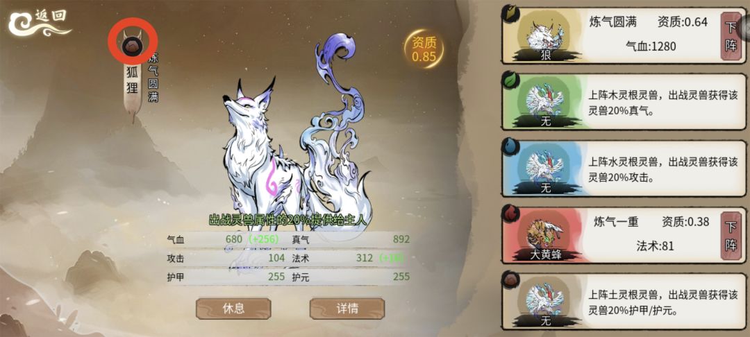 接下来是宠物 宠物有阵法 阵法上阵宠物有金 木 水 火 土 五行属性 上阵的宠物会给出战的宠物增加属性 分别为金属性上阵会增加宠物的百分之20的气血 木属性上阵会增加宠物的百分之20的真气 水属性上阵会增加宠物的百分之20的攻击 火属性上阵会增加宠物的百分之20的法术 土属性上阵会增加宠物的百分之20的双防